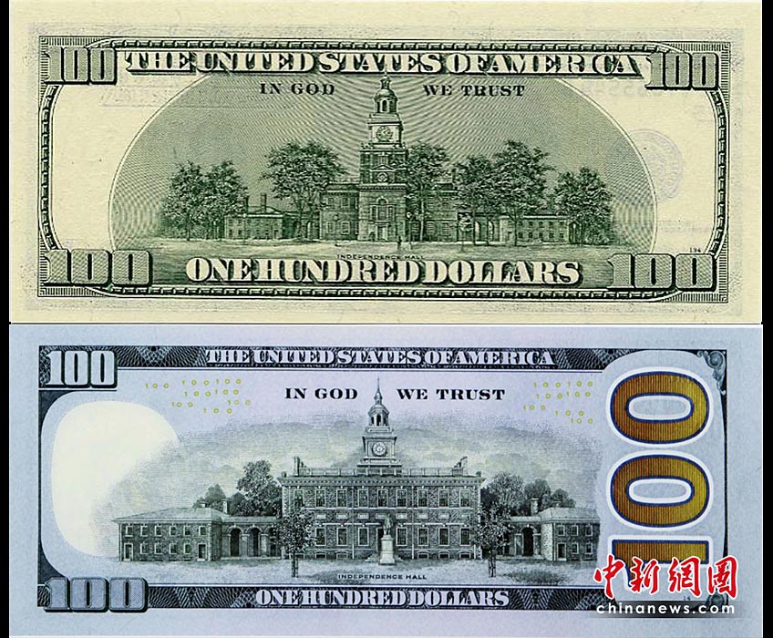 4月21日,美國財(cái)政部和美聯(lián)儲共同發(fā)布新版100美元面值的紙幣票樣。此次發(fā)行新版百元美鈔旨在防范假鈔,同時(shí),老版美元仍將繼續(xù)流通。圖片來源:中國新聞網(wǎng)