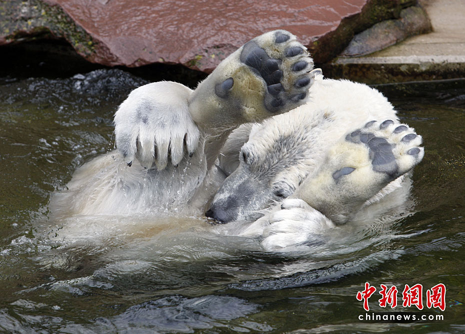 4月23日,德國紐倫堡動物園內(nèi),兩頭北極熊在公園內(nèi)的水池中盡情玩耍,享受春天的陽光。圖片來源:中國新聞網(wǎng)