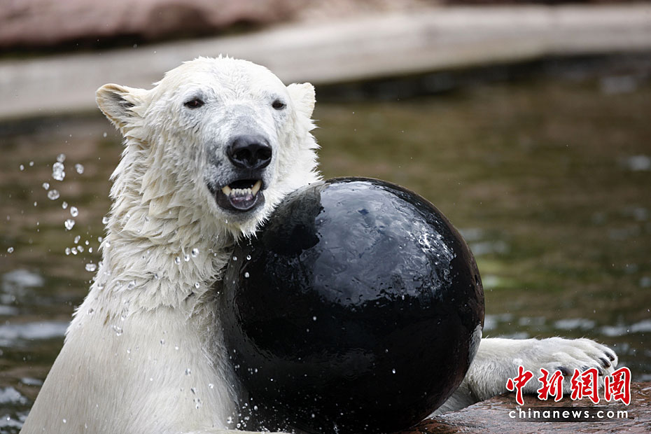 4月23日,德國(guó)紐倫堡動(dòng)物園內(nèi),兩頭北極熊在公園內(nèi)的水池中盡情玩耍,享受春天的陽(yáng)光。圖片來(lái)源:中國(guó)新聞網(wǎng)