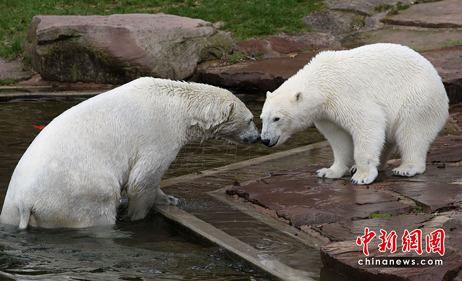 4月23日,德國紐倫堡動物園內(nèi),兩頭北極熊在公園內(nèi)的水池中盡情玩耍,享受春天的陽光。圖片來源:中國新聞網(wǎng)
