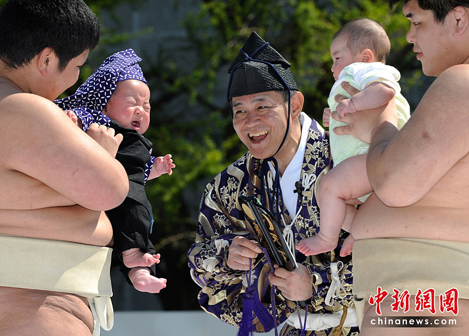 4月25日,日本東京,幾名相撲手手抱嬰兒,正努力使嬰兒哭泣。當日,一年一度的日本一周歲以下嬰兒啼哭大賽在東京淺草寺舉行。第一個讓嬰兒哭泣的選手將贏得比賽,日本通過此種比賽為孩子的健康祈福,他們認為嬰兒哭泣將對他們將來的身體健康有利。圖片來源:中國新聞網(wǎng)