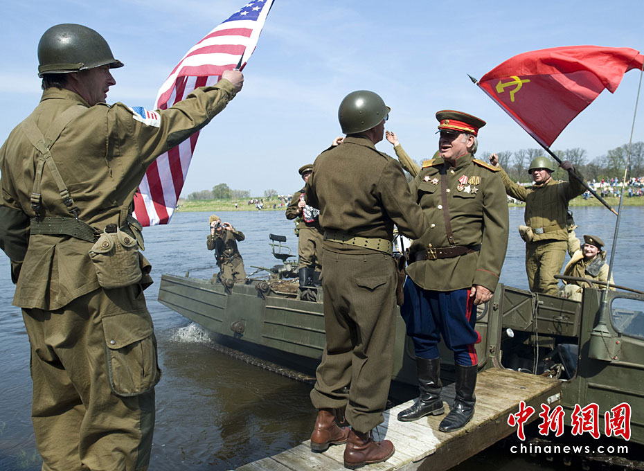 德國(guó)當(dāng)?shù)貢r(shí)間4月24日,演員身著二戰(zhàn)時(shí)期美蘇軍裝在德國(guó)托爾高南部易北河畔的一座小橋上重現(xiàn)當(dāng)年的“會(huì)師”一幕。