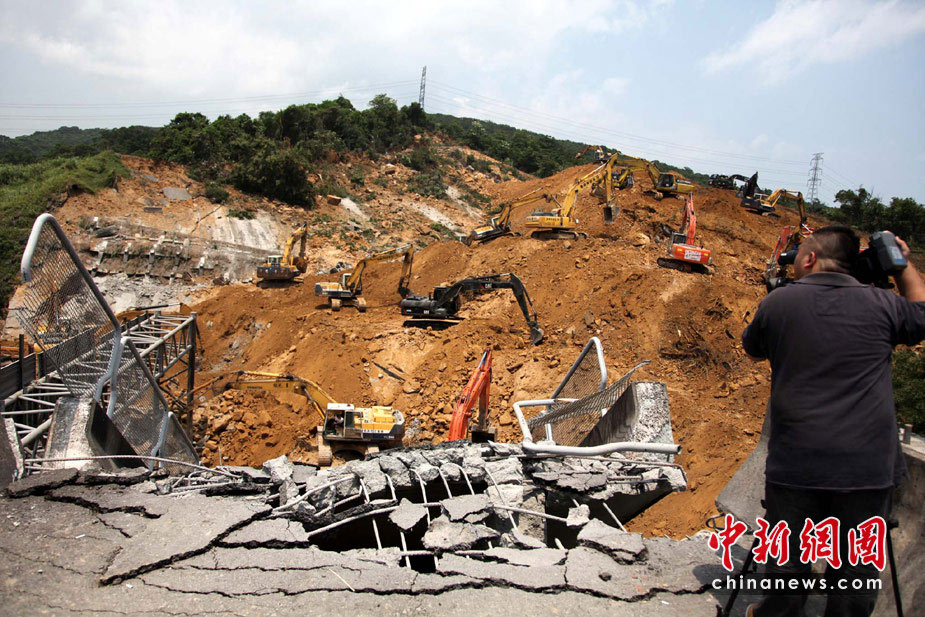 4月26日,臺(tái)灣“北二高”基隆段山崩斷橋意外第2天,工程人員繼續(xù)開挖,將攔腰被斬?cái)嗟穆窐虿鸪形磳か@被埋的數(shù)輛人車。圖為當(dāng)日中午,記者另繞山路爬上斷橋拍到的情景,依然觸目驚心。中新社發(fā) 董會(huì)峰 攝