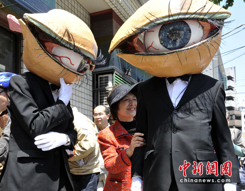 4月26日,日本一個(gè)表演藝術(shù)團(tuán)體扮成“獨(dú)眼怪人”在街頭亮相,大玩行為藝術(shù)。