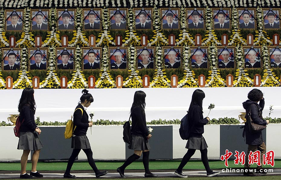 4月29日上午,韓國(guó)“天安”艦遇難官兵遺體告別儀式在平澤海軍第二艦隊(duì)司令部安保公園舉行。韓國(guó)總統(tǒng)李明博攜夫人參加告別儀式。圖片來源:中國(guó)新聞網(wǎng)