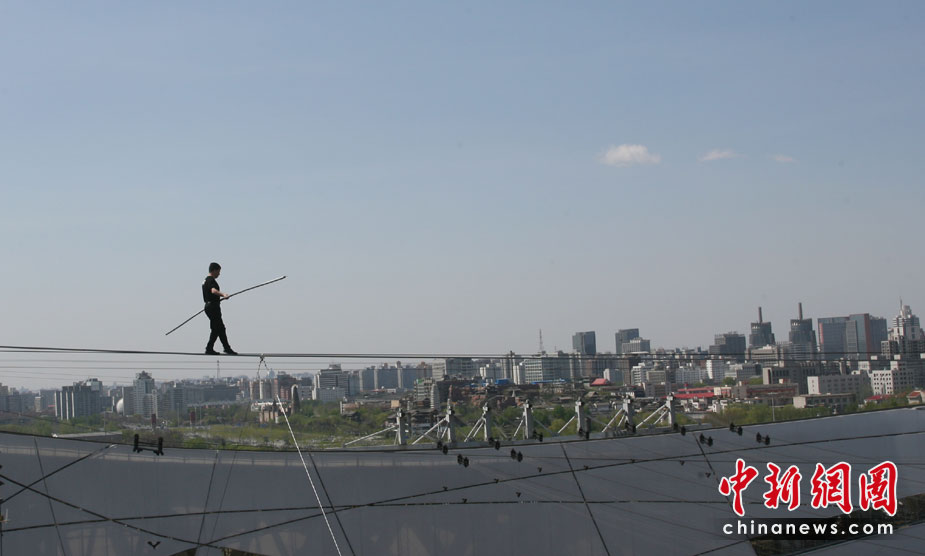 4月29日,有高空王子之稱的新疆小伙阿迪力在鳥巢上空成功試演達(dá)瓦孜(高空走鋼絲)。5月3日起,他將在北京國家體育場(鳥巢)頂棚上搭建的小屋生存60天,其間每天將進(jìn)行約5個(gè)小時(shí)的高空走鋼絲表演。 中新社發(fā) 蘇丹 攝