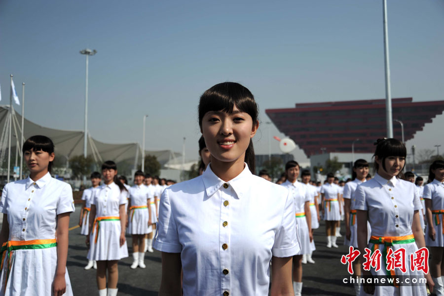 4月30日晚,舉世矚目的上海世博會(huì)開(kāi)幕式將在黃浦江畔世博園區(qū)舉行。圖為上海世博會(huì)禮儀小姐正在做最后準(zhǔn)備。中新社發(fā) 許康平 攝