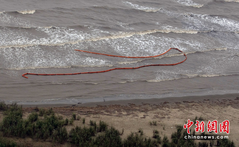 4月30日,在美國(guó)路易斯安那州海岸,為阻隔原油擴(kuò)散而設(shè)的護(hù)欄帶被海風(fēng)浪沖到岸邊。當(dāng)天,美國(guó)總統(tǒng)奧巴馬下令調(diào)查墨西哥灣石油鉆井平臺(tái)爆炸事件,以避免將來(lái)類似事件再次發(fā)生。平臺(tái)爆炸沉沒(méi)后泄漏的原油當(dāng)天已漂至美國(guó)沿岸。圖片來(lái)源:中國(guó)新聞網(wǎng)