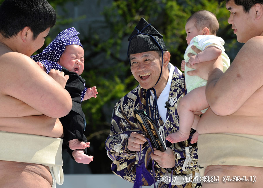 4月25日,日本東京,幾名相撲手手抱嬰兒,正努力使嬰兒哭泣。當(dāng)日,一年一度的日本一周歲以下嬰兒啼哭大賽在東京淺草寺舉行。圖片來源:中國(guó)新聞網(wǎng)>>點(diǎn)擊觀看詳細(xì)內(nèi)容