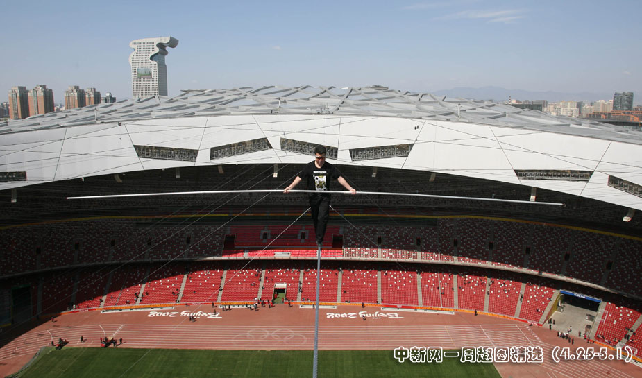 4月29日,有高空王子之稱的新疆小伙阿迪力在鳥巢上空成功試演達(dá)瓦孜(高空走鋼絲)。5月3日起,他將在北京國家體育場(鳥巢)頂棚上搭建的小屋生存60天,其間每天將進(jìn)行約5個小時的高空走鋼絲表演。 圖片來源:中國新聞網(wǎng)>>點(diǎn)擊觀看詳細(xì)內(nèi)容
