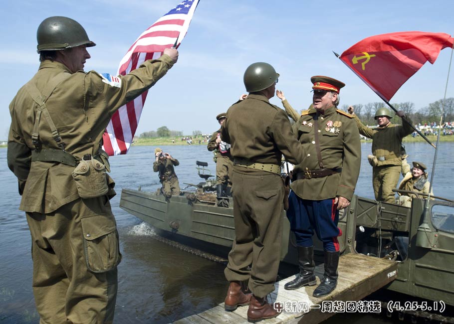 德國當(dāng)?shù)貢r(shí)間4月24日,演員身著二戰(zhàn)時(shí)期美蘇軍裝在德國托爾高南部易北河畔的一座小橋上重現(xiàn)當(dāng)年的“會(huì)師”一幕。圖片來源:中國新聞網(wǎng)>>點(diǎn)擊觀看詳細(xì)內(nèi)容