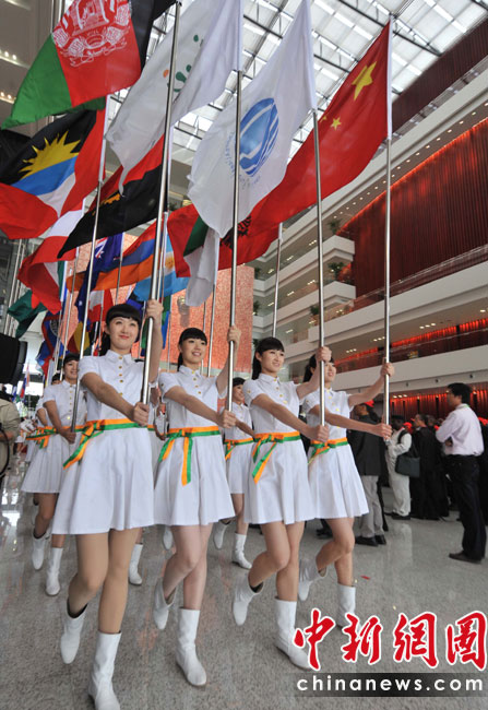 5月1日,上海世博會(huì)舉行開園儀式,美女旗手高舉參展國(guó)家和地區(qū)、組織的旗幟入場(chǎng)。中新社發(fā) 賈國(guó)榮 攝