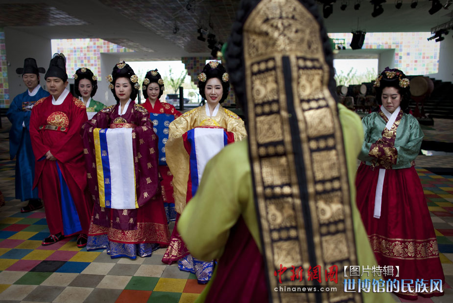 5月1日,上海世博會正式開園。圖為在韓國館內接待人員身著民族特色服飾迎接參觀者。
