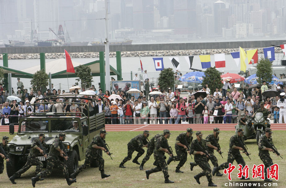 為慶祝“五一”國(guó)際勞動(dòng)節(jié),進(jìn)一步增進(jìn)與香港社會(huì)各界相互溝通與交流,中國(guó)人民解放軍駐香港部隊(duì)5月1日開(kāi)放了昂船洲軍營(yíng),圖為“獵人戰(zhàn)斗”表演。中新社發(fā) 張勤 攝