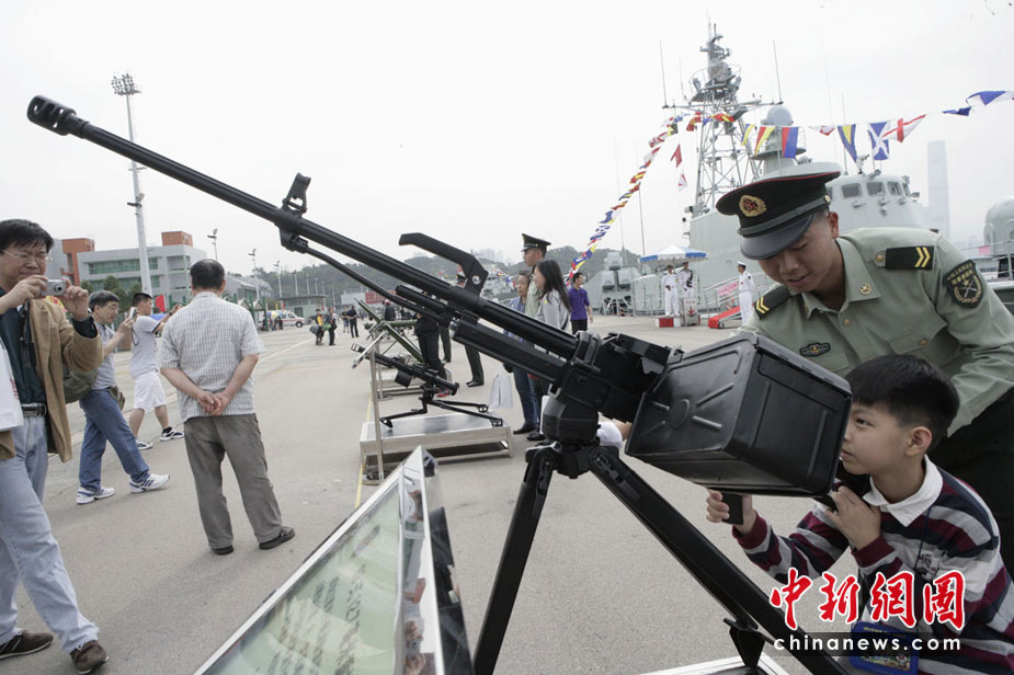 為慶祝“五一”國(guó)際勞動(dòng)節(jié),進(jìn)一步增進(jìn)與香港社會(huì)各界相互溝通與交流,中國(guó)人民解放軍駐香港部隊(duì)5月1日開放了昂船洲軍營(yíng),共有約13000名市民前往參觀。圖為香港市民近距離參觀武器展示。中新社發(fā) 張勤 攝