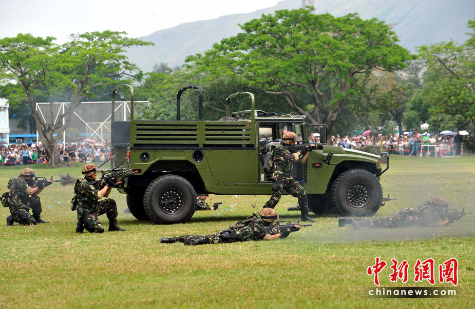 為慶祝“五一”國際勞動節(jié),進一步增進與香港社會各界相互溝通與交流,中國人民解放軍駐香港部隊5月2日開放了石崗軍營。圖為駐港部隊“獵人戰(zhàn)斗”表演。 中新社發(fā) 鄧慶樂 攝