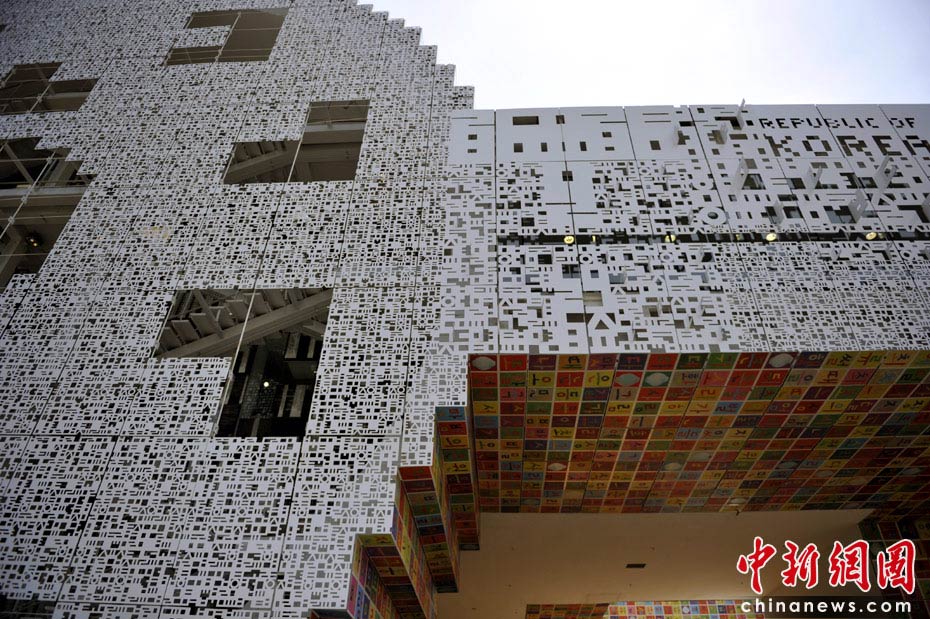 韓國館是由韓文來“建造”的,遠(yuǎn)觀展館,由幾個碩大的韓文字母連接而成;近看外墻,則為無數(shù)凹凸有致的韓文字母。中新網(wǎng)記者 王紅綱 攝