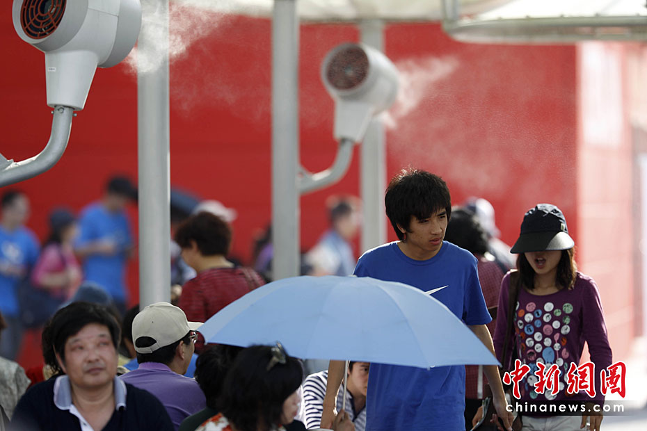 2010年5月2日,上海世博園區(qū)啟動(dòng)各項(xiàng)控溫降溫設(shè)施應(yīng)對(duì)高溫。圖為游客休息區(qū)內(nèi)啟動(dòng)噴霧降溫系統(tǒng)。中新社記者 盛佳鵬 攝