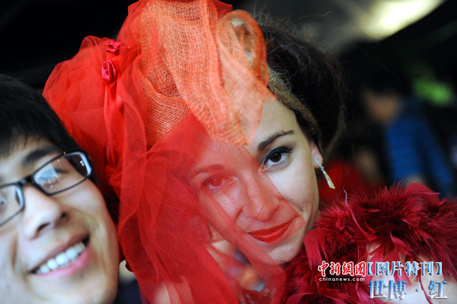 紅色象征著熱量與活力,紅色也象征著興奮與激情,在世博園區(qū)內(nèi)游覽,總會有一抹濃艷的紅色闖入到記者鏡頭之中,讓世博變得更加火辣。圖為法國館工作人員與游客合影。中新社記者 廖攀 攝
