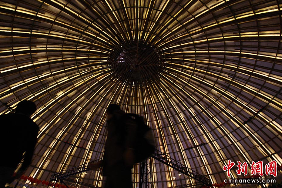 5月2日,上海世博會(huì)是第一個(gè)正式提出“低碳世博”理念的世博會(huì),圍繞著這樣的理念,上海世博園區(qū)內(nèi)的低碳元素比比皆是。圖為印度館內(nèi)竹制的世界最大穹頂,這個(gè)竹制穹頂上方是小型風(fēng)力發(fā)電裝置和太陽(yáng)能電池板,為整個(gè)場(chǎng)館提供綠色清潔能源。中新社發(fā) 湯彥俊 攝