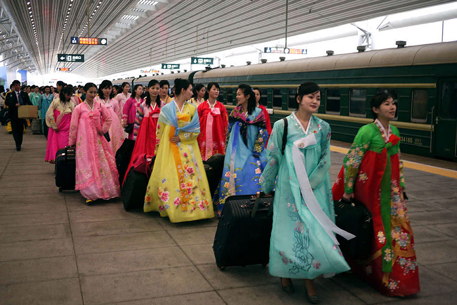 5月2日,載著198名朝鮮紅樓夢(mèng)劇組演員的專列駛?cè)氲|口岸。由朝鮮國家級(jí)藝術(shù)團(tuán)-血海歌劇團(tuán)創(chuàng)作的歌舞劇《紅樓夢(mèng)》將于5月6日至9日登陸北京電視臺(tái)大劇院,這個(gè)超大演員陣容亦創(chuàng)下近年來華國外演出人數(shù)之最。圖片來源:新華網(wǎng)