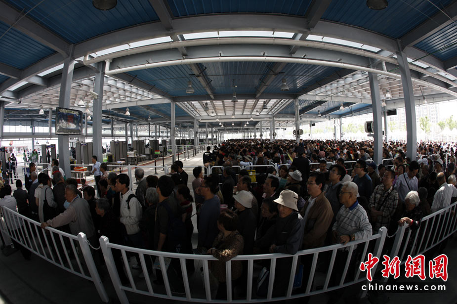上海世博會4日迎來首個平日票的參觀客潮,圖為世博園區(qū)7號門入口外,還不到開園時間,已經(jīng)有大批游客排隊等候。中新社記者 盛佳鵬攝