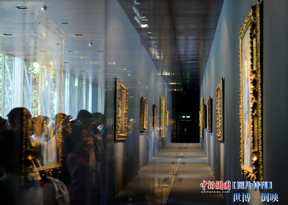 世博園法國館內(nèi),游客拍攝著玻璃罩內(nèi)的國寶油畫。中新社記者 廖攀 攝