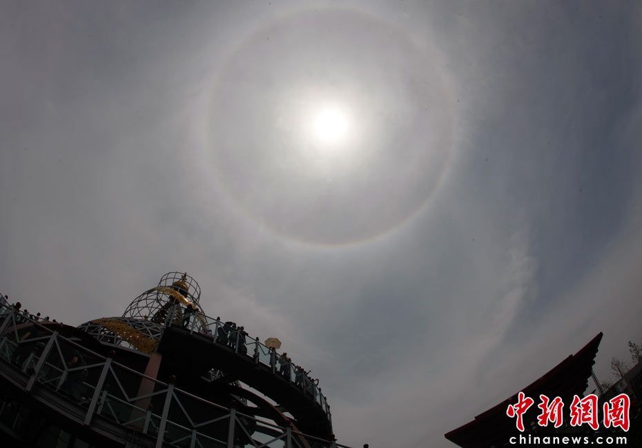 2010年5月4日,上海世博園區(qū)上空出現(xiàn)日暈,與中國國家館和尼泊爾館相映成趣。中新社發(fā) 盛佳鵬 攝