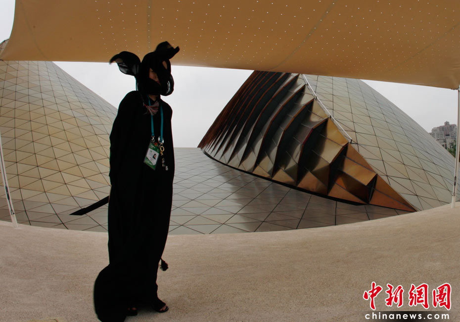 2010年5月4日,上海世博園區(qū)阿聯(lián)酋館前,一位阿聯(lián)酋女工作人員的面紗被風吹起。當日,上海世博園區(qū)迎來首個平日票的參觀客潮。中新社發(fā) 盛佳鵬 攝