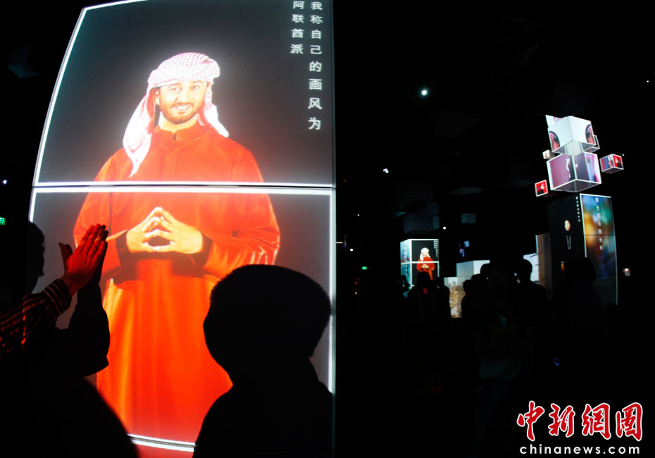2010年5月4日,上海世博園區(qū)內(nèi)的阿聯(lián)酋館,虛擬解說員為游客介紹阿聯(lián)酋的歷史、文化等。中新社發(fā) 盛佳鵬 攝