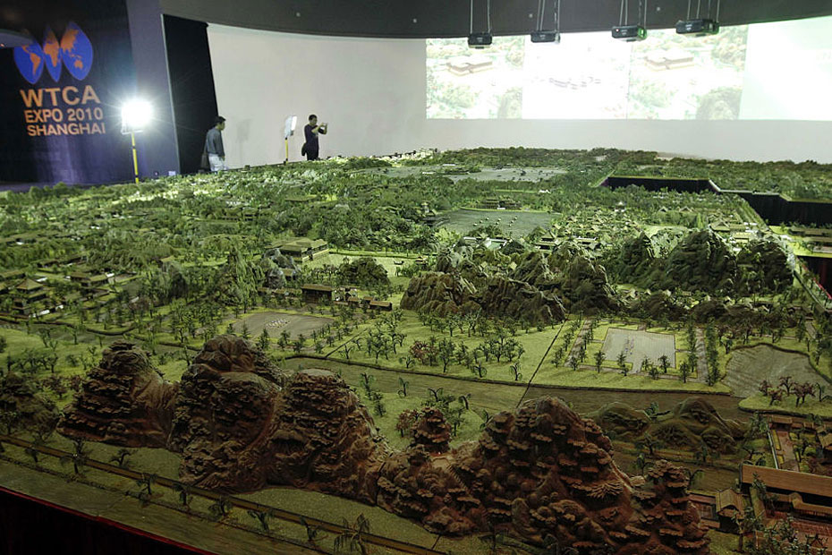 5月4日,游客在參觀縮微版“圓明園”。近日,一座“全景式巨型立雕圓明園”在上海世博會世界貿(mào)易中心協(xié)會館亮相。這座縮微版的“圓明園”以1比150的比例制作而成,再現(xiàn)了全盛時(shí)期的圓明園雄偉壯觀的全景。圖片來源:新華網(wǎng) 裴鑫 攝