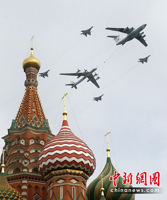 當(dāng)?shù)貢r間5月4日,在俄羅斯首都莫斯科,參加彩排的戰(zhàn)機編隊飛過紅場上空。俄羅斯將于5月9日隆重紀(jì)念衛(wèi)國戰(zhàn)爭勝利65周年。圖片來源:中國新聞網(wǎng)
