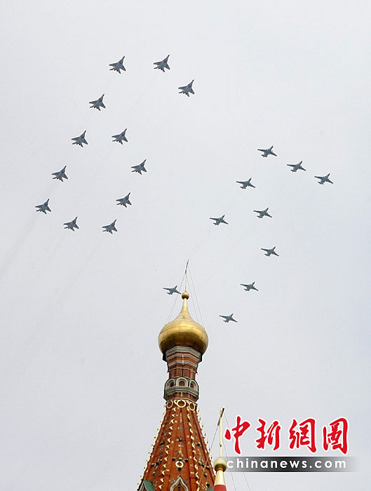 當?shù)貢r間5月4日,在俄羅斯首都莫斯科,參加彩排的戰(zhàn)機編隊飛過紅場上空。俄羅斯將于5月9日隆重紀念衛(wèi)國戰(zhàn)爭勝利65周年。圖片來源:中國新聞網(wǎng)