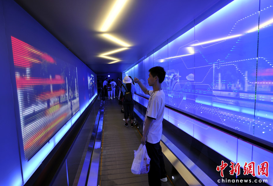 進入互動區(qū)的滾梯兩側(cè)是炫麗的屏幕,頭頂上方還不時滑過一道道“閃電”。中新網(wǎng)記者 王紅綱 攝