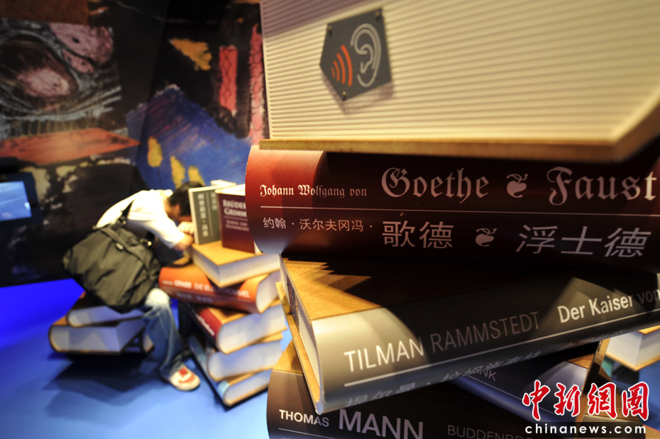 德國文化的展示區(qū),桌面的讀者可不是睡著了,那本書是可以發(fā)聲的,他也許是“沉浸”在故事中了。中新網(wǎng)記者 王紅綱 攝