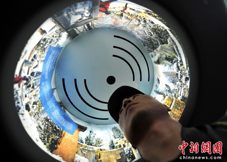 360度環(huán)繞視聽體驗,像個燈罩一樣,游客可以把頭伸進(jìn)去,聲音效果的確不錯。中新網(wǎng)記者 王紅綱 攝