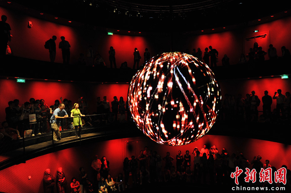 德國館的高潮就是它的最后部分“動(dòng)力之源”?梢匀菁{600人的動(dòng)力之源大廳圓形環(huán)廊是一個(gè)圓錐形空間,中間懸掛著一個(gè)重達(dá)1.5噸、直徑達(dá)3米的巨大金屬球,四周則有一圈供游客駐足的走廊。黑漆漆的大廳里,兩個(gè)虛擬主持人邀請(qǐng)觀眾同時(shí)大聲吶喊。隨著吶喊聲的加大,動(dòng)力球慢慢擺動(dòng)起來,聲音越大擺動(dòng)幅度越大,甚至繞圈飛行。圓球表面40萬根發(fā)光的LED管,逐漸閃現(xiàn)出德國人對(duì)未來城市生活的暢想畫面。這是一場(chǎng)7分鐘的互動(dòng)體驗(yàn)。在這里觀眾才是主角。中新網(wǎng)記者 王紅綱 攝