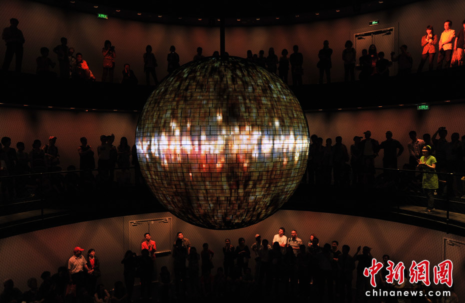 德國(guó)館的高潮就是它的最后部分“動(dòng)力之源”?梢匀菁{600人的動(dòng)力之源大廳圓形環(huán)廊是一個(gè)圓錐形空間,中間懸掛著一個(gè)重達(dá)1.5噸、直徑達(dá)3米的巨大金屬球,四周則有一圈供游客駐足的走廊。黑漆漆的大廳里,兩個(gè)虛擬主持人邀請(qǐng)觀眾同時(shí)大聲吶喊。隨著吶喊聲的加大,動(dòng)力球慢慢擺動(dòng)起來(lái),聲音越大擺動(dòng)幅度越大,甚至繞圈飛行。圓球表面40萬(wàn)根發(fā)光的LED管,逐漸閃現(xiàn)出德國(guó)人對(duì)未來(lái)城市生活的暢想畫面。這是一場(chǎng)7分鐘的互動(dòng)體驗(yàn)。在這里觀眾才是主角。中新網(wǎng)記者 王紅綱 攝