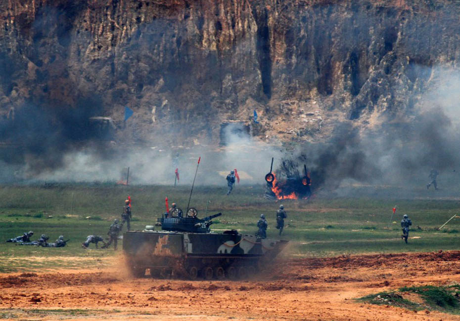 陸戰(zhàn)隊在訓練場進行登陸作戰(zhàn)實兵實彈演練。圖片來源:新華網(wǎng) 查春明攝