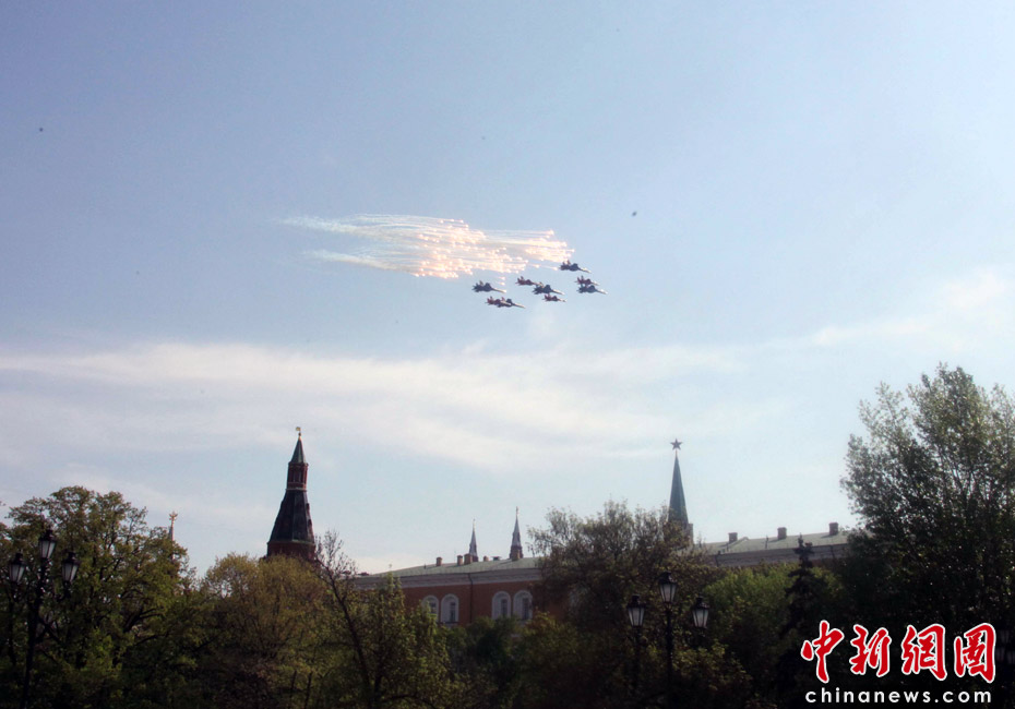 5月9日,俄羅斯在莫斯科紅場(chǎng)舉行盛大的閱兵式,慶祝衛(wèi)國(guó)戰(zhàn)爭(zhēng)勝利65周年。莫斯科時(shí)間5月9日上午10點(diǎn)(北京時(shí)間9日下午2點(diǎn))許,閱兵式正式開(kāi)始。圖為空中梯隊(duì)飛越紅場(chǎng)上空。中新網(wǎng)記者 張朔 攝