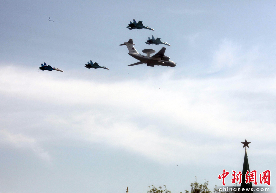 5月9日,俄羅斯在莫斯科紅場舉行盛大的閱兵式,慶祝衛(wèi)國戰(zhàn)爭勝利65周年。莫斯科時間5月9日上午10點(北京時間9日下午2點)許,閱兵式正式開始。2--圖為空中梯隊穿越紅場上空接受檢閱。張朔 攝