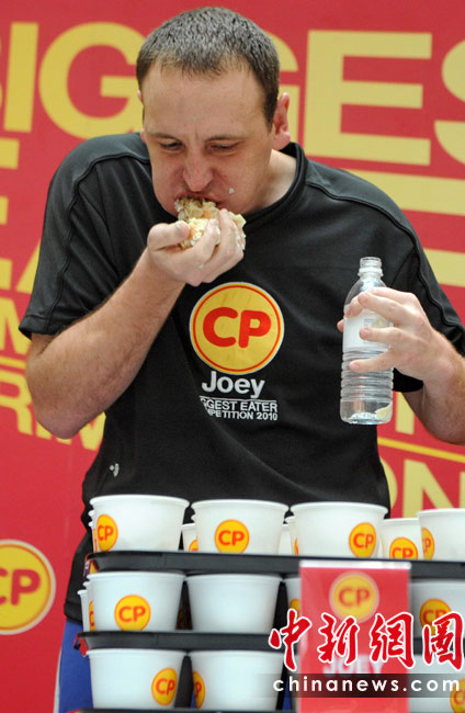 5月9日,新加坡舉行了一場(chǎng)別開生面的世界吃餛飩大賽,來(lái)自全球各地的多名大胃王在比賽中一較高下。最終在8分鐘內(nèi)狂吞380個(gè)的美國(guó)選手獲得了冠軍。圖為最終獲得冠軍的美國(guó)選手。