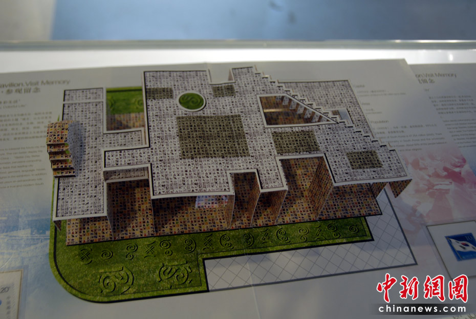 世博園區(qū)內(nèi)的特許商品店里,折紙場(chǎng)館惟妙惟肖,頗受游客的喜愛。圖為韓國館紙模型。中新網(wǎng)記者 吳歆 攝