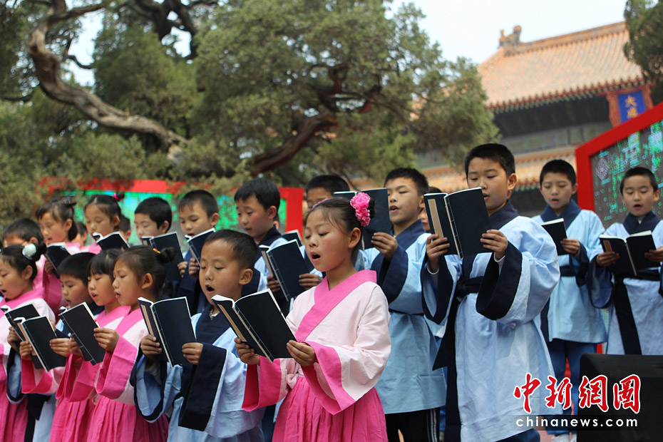 5月15日,首屆“兩岸漢字藝術(shù)節(jié)”新聞發(fā)布會(huì)在北京孔廟舉行。原文化部長(zhǎng)、著名作家王蒙與臺(tái)灣文化總會(huì)會(huì)長(zhǎng)劉兆玄等共同書(shū)寫(xiě)漢字——“漢字藝術(shù)源遠(yuǎn)流長(zhǎng)”。 中新社發(fā) 蘇丹 攝