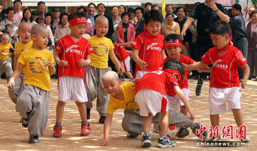 2010年5月15日,韓國(guó)首爾曹溪寺院舉行了兒童足球賽,一群四五歲的孩子和小和尚參加了這場(chǎng)足球友誼賽。這場(chǎng)比賽是佛誕節(jié)活動(dòng)的一部分,也是為了迎接2010世界杯足球賽的到來。Chung Sung-Jun (圖片來源:CFP)