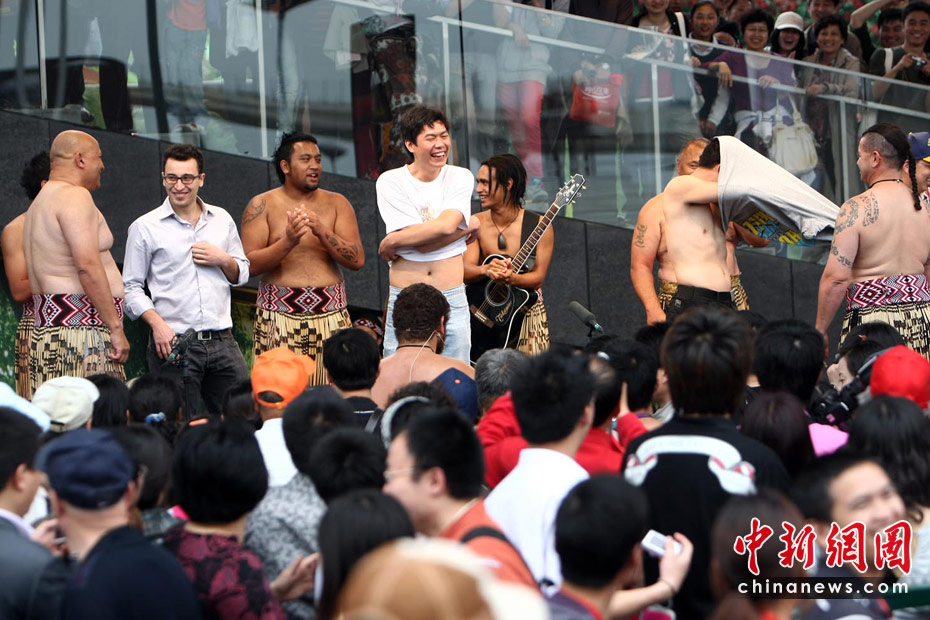 5月初,游客在上海世博會新西蘭館前赤膊上陣學(xué)跳毛利舞。中新社記者 杜洋 攝