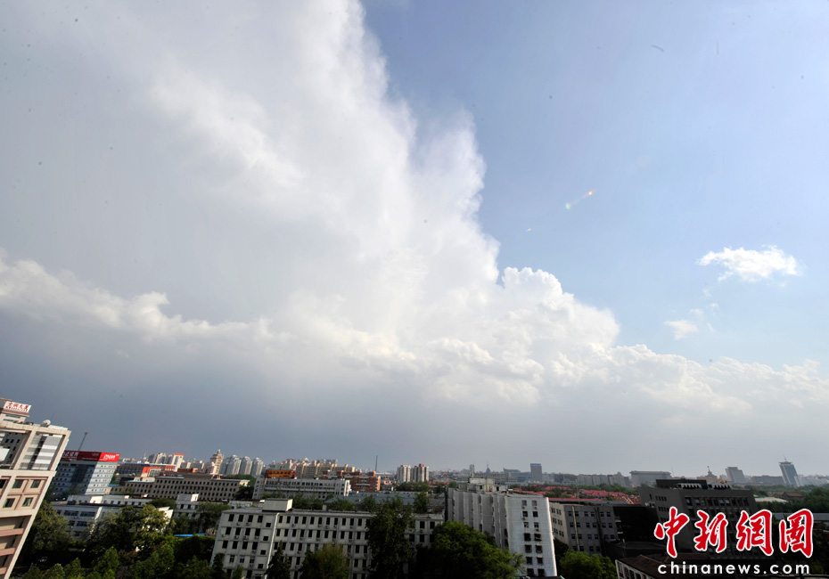 5月18日16時(shí)許,伴隨陣陣?yán)茁暰┏峭唤荡笥,降雨過(guò)后東部天空依然籠罩著烏云,而西邊卻已放晴。中新網(wǎng)記者 金碩 攝