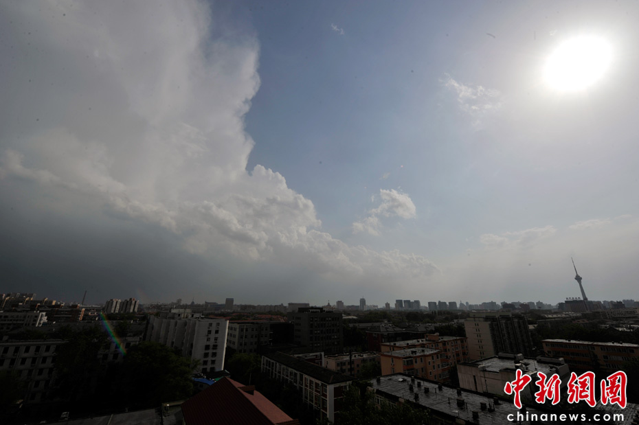 5月18日16時(shí)許,伴隨陣陣?yán)茁暰┏峭唤荡笥,降雨過后東部天空仍籠罩著密布的烏云,而此時(shí)西邊則出現(xiàn)了落日。中新網(wǎng)記者 金碩 攝