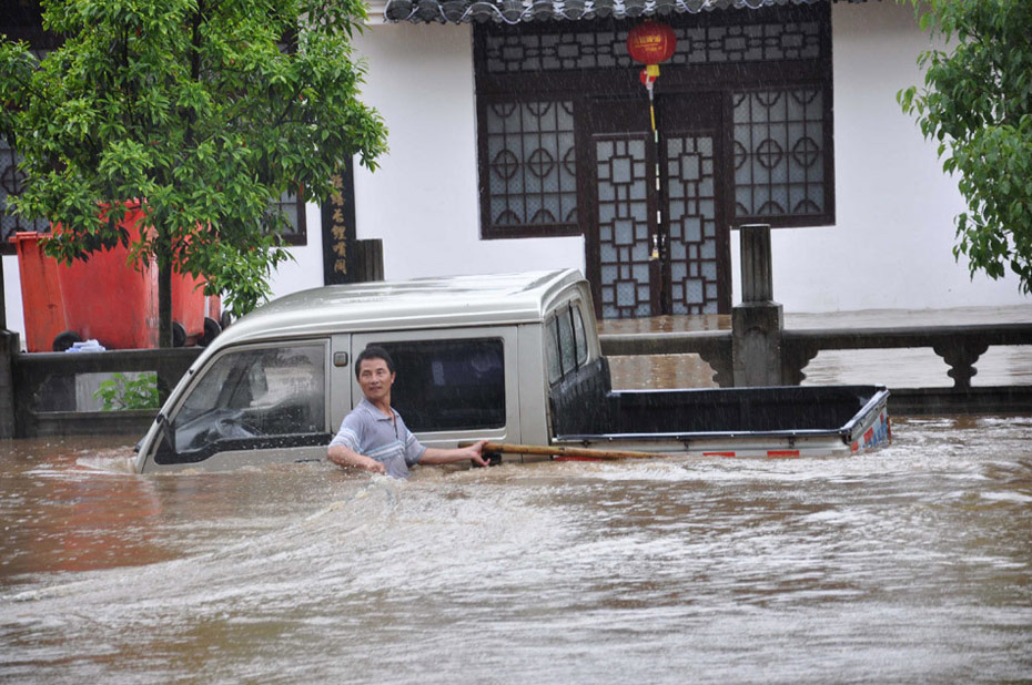 2010年5月18日,江西婺源遭受暴雨洪澇災(zāi)害,在婺源縣城,一輛汽車(chē)和車(chē)主被洪水圍困。單長(zhǎng)華 攝 (圖片來(lái)源:新華網(wǎng))