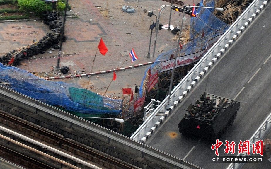 19日清晨,數(shù)百名軍警在武裝車輛的掩護(hù)下向反政府示威者在曼谷的大本營(yíng)聚集。自上周四紅衫軍與政府在曼谷爆發(fā)沖突以來,已經(jīng)導(dǎo)致39人死亡,數(shù)百人受傷。